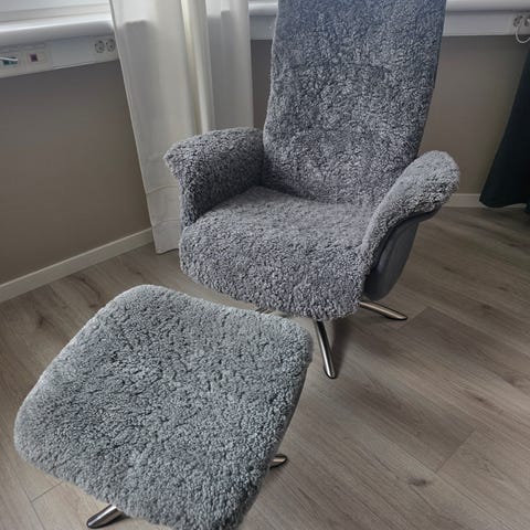 Nyrenoverad Emmafåtölj. Fårskinn från Skandilock i färgen moonlight.