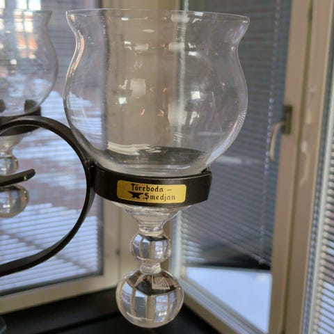 Taklampa med fyra lampor i glaskupa samt sex ljushållare för stearinljus eller värmeljus.