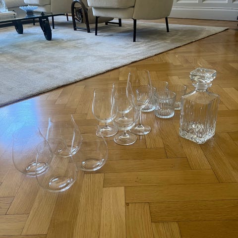 2st whiskeykaraffer, varav ena från Nachtmann (nypris ca 1300kr) samt 4st mindre vatten/vinkaraffer. Hämtas i Älvsjö.