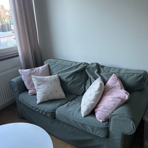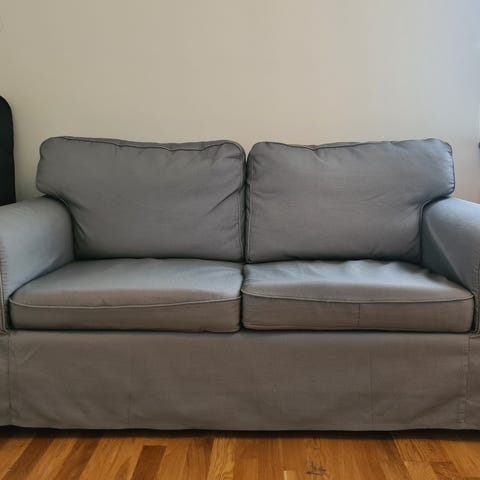 Soffan har några år på nacken och den har lite fläckar samt ett litet hål på ena sidan i klädseln, annars är soffan i bra skick. Klädseln går att ta av och tvätta, annars finns det ny klädsel att köpa på antingen IKEA, Comfortly eller Bemz hemsida. 2 st extra vita överdrag till sittdynorna & ryggkuddarna medföljer.