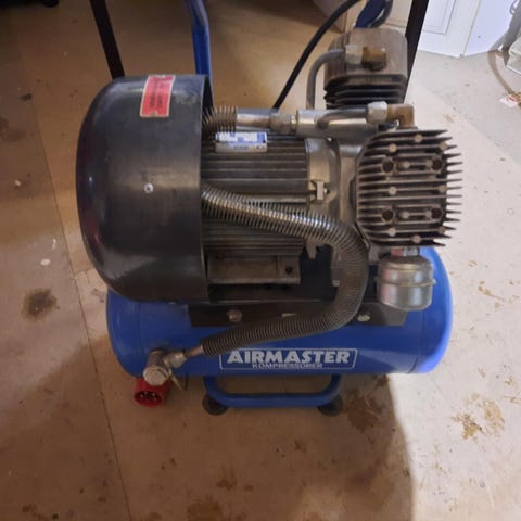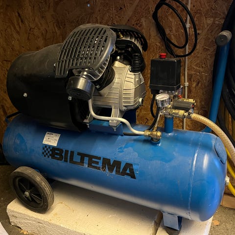 Biltema kompressor med enfasmotor. Effekten är 3 hk (2,2 kW), 230 V, 13 A, 50 Hz. Motorns varvtal är 1420 rpm. Kompressorn är blå och monterad på liggande tank med hjul och handtag för förflyttning. Utrustad med manometer och elanslutning för vanligt vägguttag (230 V). Lämplig för tryckluftsverktyg, pumpning och andra arbetsuppgifter där komprimerad luft behövs i garage eller hobbyverkstad.