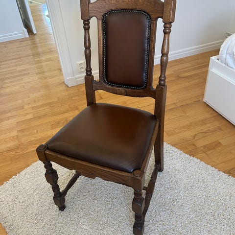 4st likadana stolar som är handgjorda av Gösta Holmer. Sit och rygg i läderklädsel. Sitthöjd 45cm. Har fina detaljer