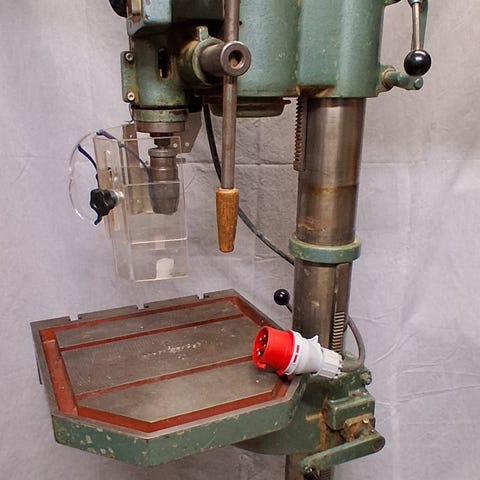 Arboga pelarborrmaskin. Maskinen är fristående med pelarkonstruktion och fotplatta. Utrustad med justerbart bord och matningshandtag för precisionsborrning.