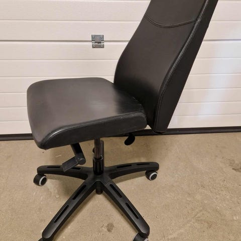 Kontorsstol med hög rygg i svart färg. Stolen har sits och nackstöd i svart konstläder samt ryggstöd i svart nätmaterial. Utrustad med hjulkryss och gasfjäder för höjdjustering. Passar som arbetsstol vid skrivbord i hem eller kontor. Funkar väl som gamingstol eller fåtölj då den är jättebekväm. En mjuk dyna följer med som dels gör stolen ännu bekvämare samt skymmer den det lilla slitaget längst ner på stolen. Stolen saknar armstöd vilket inte har besvärat mig då jag använt mitt kontorsbord som armstöd istället. Man kan luta bakåt på den med vilket passar fint till filmtittande. Hör av er.