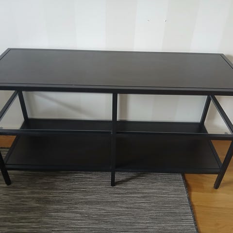 Säljer en stilren TV-bänk från Scandinavian Design. Modern minimalistisk design i svart, mycket stabil konstruktion i tung metall. Praktiska sidofack och hyllor med gott om förvaring för mediautrustning och inredning.
