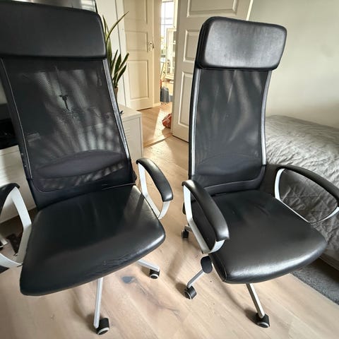 Vi säljer två bekväma och praktiska kontorsstolar i svart utförande. Stolarna har ventilerande mesh-rygg, mjuk sits och rullar lätt på hjul – perfekta till hemmakontor, skrivbord eller studier.