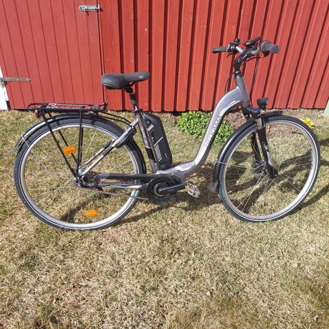 Min mycket omtyckta elcykel för kvinna med ramstorlek S och 26" hjul. Cykeln har lågt insteg, batteri monterat på ramen och medföljande Bosch-laddare. Utrustad med pakethållare, skärmar, belysning fram, kedjeskydd och bekväm sadel. Passar för vardagscykling och pendling i stadsmiljö och på cykelvägar. Säljer pgr av egna balansproblem (ålder)