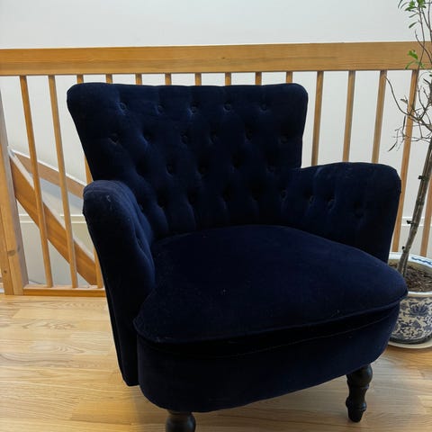 Fåtöljen är klädd i mjuk sammet och köptes för cirka 6 år sedan från Line Textiler i Alvik. Den är bekväm och stadig – perfekt som läsfåtölj eller som en stilren detalj i vardagsrummet.