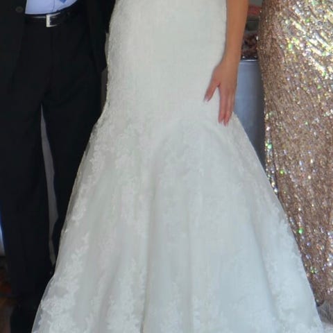 Denna brudklänningen får ALLA att tappa hakan. Den är designad och specialfigursydd så att man får en otroligt vacker timglasform. Det tjocka välsydda tyget gör att den upplevs exklusiv. Baktill går den att justera med korsett för att anpassa den till just DIN kropp. Även om du inte har de perfekta kurvorna så är det mjuka byglar insydda i sidorna som hjälper till att förstärka timglasformen. En hjärtformad armbandslös urringning med sjöjungsfruform med ett otroligt lyxigt släp, gör den enkel men ändå med det där lilla extra. Den eleganta tyllen på släpet består av flera lager av volanger som ger en fyllig och dramatisk silhuett. Detta är en klänning du blir ensam om, ingen kommer att ha en likadan!