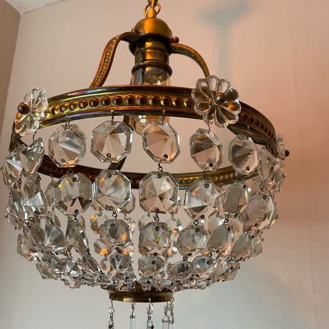 En nätt och elegant kristallkrona med kristall prismor och två lamp hållare