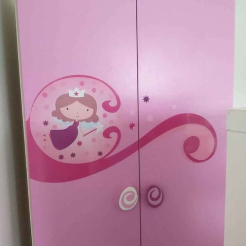 Garderob till barnrum, rymlig med lådor, hyllor och skåp. Två lampor på toppen med nätkabel.