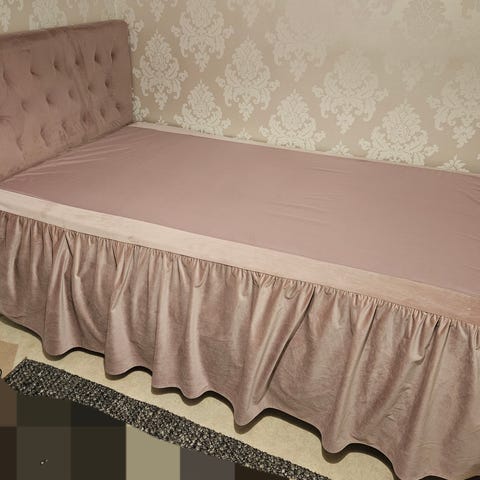 Två enkelsängar med rosa, och dekorativa knappar. Båda sängarna är 90x190cm och har förvaringslåda då sängen kan öppnas upp, tar 2500kr för en säng och 4500 för båda.