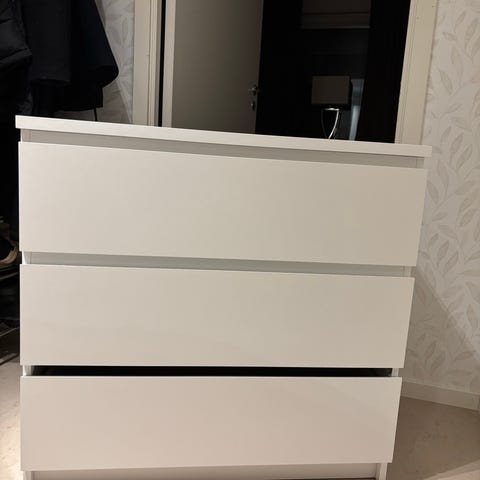 Säljer en stilren vit byrå med tre rymliga lådor, perfekt för förvaring i hall, vardagsrum eller sovrum.