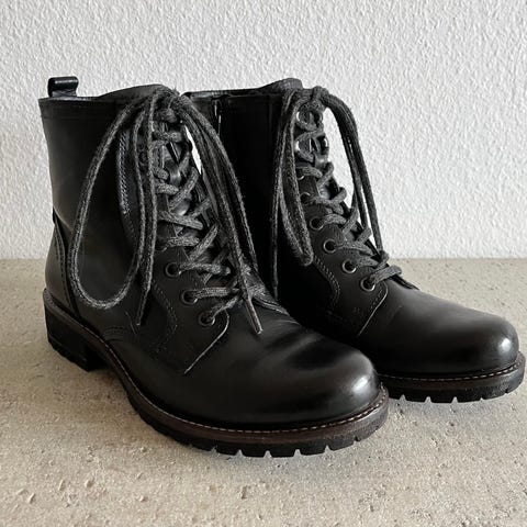 Kavat boots i storlek 36. Svarta kängor i skinn med grov yttersula. Passar som vardagssko under höst och vår.