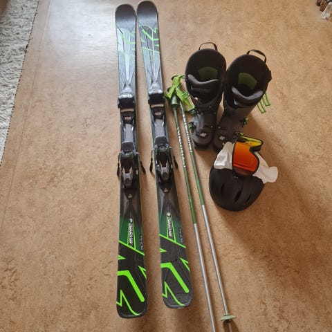 Slalomskidor barn samt pjäxor och ryggskydd