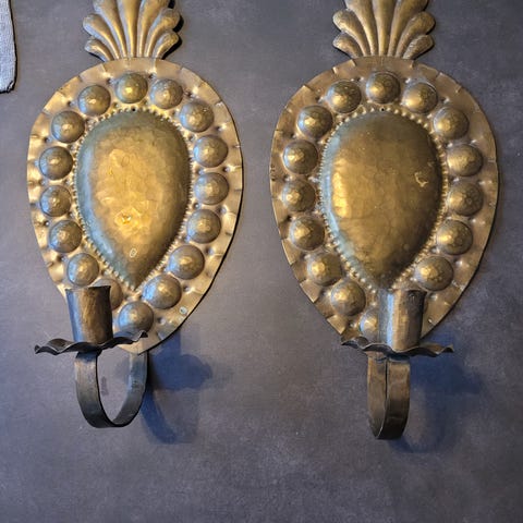 Fyra Ljusstakar och en Ljussläckare. 2 svarta ljusstakar i metall, ca 13,5 cm höga. 1 röd i porslin (keramik??) ca 12,5 cm, 1 liggande ljusstake med dekorativa rosor. Liten ljussläckare ca 13 cm lång.