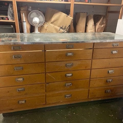 Köpmansdisk i mycket fint skick perfekt förvaring. 6 st smålådor och 9st stora