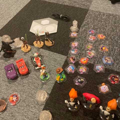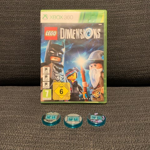 Lego Dimensions spelbrickor med motiv av Batman och Wyldstyle.Runda transparenta brickor i turkos plast med tryckta symboler på ovansidan. Används tillsammans med Lego Dimensions-spelet och portalen för att aktivera respektive figur eller fordon i spelet.