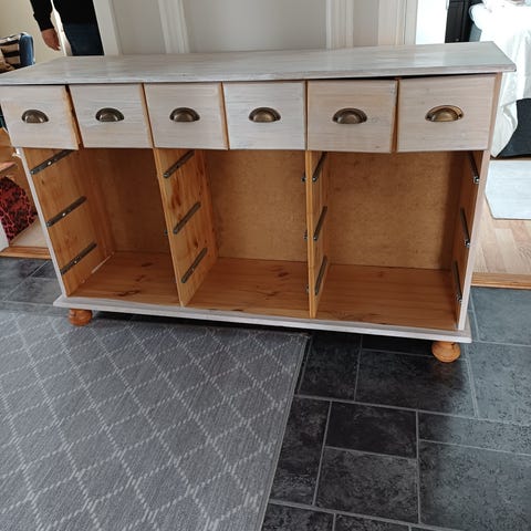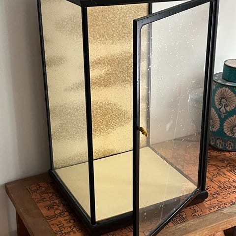 Äldre butiksvitrin med åtta lådor med display i glasmonter (två av lådorna saknas) samt lådfack i nedre del, lådor saknas. Armatur i mässing. Då några lådor saknas säljs den billigt för 500 kronor.