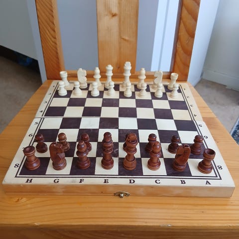 Schackspel med vikbart schackbräde i trä. Setet innehåller schackpjäser i två färger, vita och svarta, som förvaras i den hopfällda lådan. Passar för schackspel hemma eller att ta med på resa tack vare den hopfällbara designen. Saknar en schackpjäs.