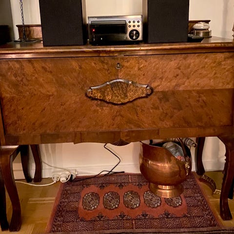 Säljer en mörk träskänk i klassisk stil med dekorativa detaljer och gott om förvaring. Möbeln har två sidosektioner med dörrar samt en mittdel med låda och skåp. Ornamenterade dörrar. Passar både som förvaring och avlastningsmöbel. Normalt slitage (kommer från ett dödsbo)
