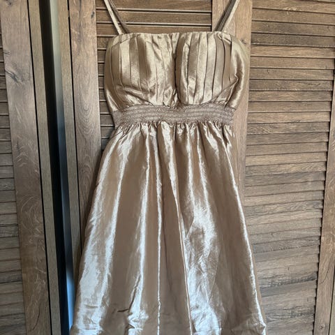 Saint Tropez party-/cocktailklänning för dam i storlek M. Klänningen är brun och tillverkad i polyester. Modellen är axelbandslös med markerad midja och vid, veckad kjol. Baksidan har smockresår för bättre passform och knytskärp i midjan. Passar som fest- eller cocktailklänning.