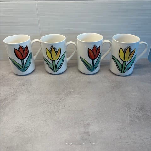 Kosta Boda tallrikar i glas med målat tulpanmotiv i rött, gult och grönt. Tallrikarna är runda med dekor runt kanten. Passar som serveringstallrikar eller uppläggningsfat i kök och matrum.