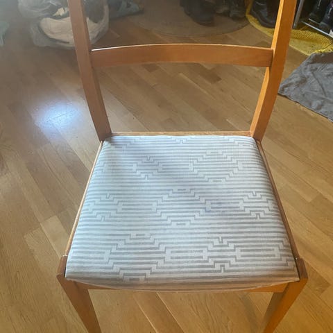 Stol i trä med naturfärgad yta. Rak rygg med lodräta ribbor och fyrkantigt sitsplan. Passar som matstol eller köksstol i hemmiljö. Enkel, klassisk design som fungerar i många olika inredningsstilar.