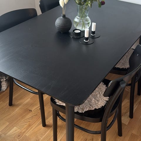 Både bord och stolar är målade i en helmatt svart färg som upplevs något kladdig, vilket gör att ytan är svår att hålla helt ren. Det finns även färgbortfall här och där. Möblerna är i grunden stabila och fina, men skulle verkligen behöva lite kärlek i form av en slipning och ommålning.