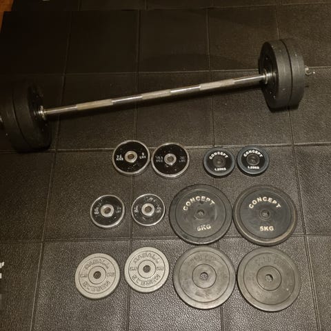 Skivstång med vikter: Star Gear 20 kg Barbell Set från Gymgrossisten. Skivor: 2 * 5kg, 2 * 2.5kg, 2 * 1.25kg