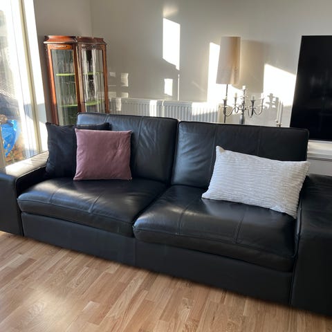 Soffan är använd men väl omhändertagen. Det finns mindre tecken på användning på ena sidan av kuddarna, men de är vändbara vilket gör att det inte syns när man använder den.