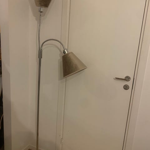 Stilren golvlampa i krom med svart lampskärm i sammet.
