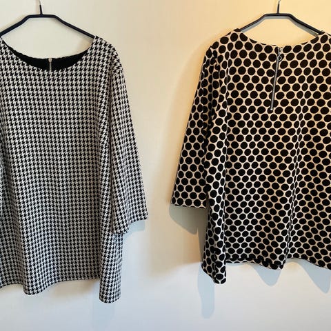 Tröjan är stickad i svart och vitt i 80%akryl och 20% bomull. Klädsam form, lite längre baktill och dragkedjedetalj med band bak i nacken.