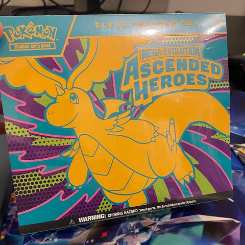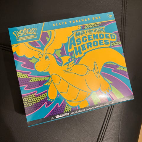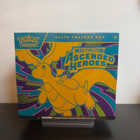 Pokémon Mega Evolution Ascended Heroes Elite Trainer Box spelkortslåda. Boxen är avsedd för Pokémon Trading Card Game och innehåller tillbehör för kortspel, såsom kort, tärningar, markörer och samlarlåda enligt serien Ascended Heroes. Produkten är anpassad för bordsspel med Pokémon-tema och passar för spelare och samlare av Pokémon TCG.
