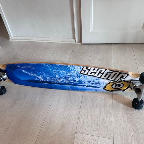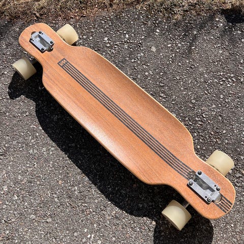 Lopoli longboard i trä med gröna hjul. Ovansidan har svart grepptejp och undersidan är i träfärg med tryck och dekaler. Utrustad med truckar i metall och stora hjul som lämpar sig för cruising och pendling på asfalt och andra hårda underlag. Passar både ungdomar och vuxna beroende på åkarens längd och vikt.