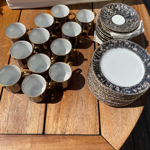 Mockakoppar med fat i porslin i blått och vitt med gulddetaljer. Setet består av 12 koppar med matchande far. Dekoren är placerad både på kopp och fat.