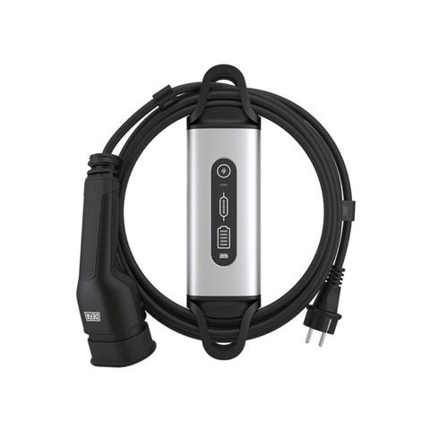 En elbilsladdare med 6 meter kabel, kommer i en Samsonite väska så man kan ta den med sig laddaren när man är iväg till stugan etc.