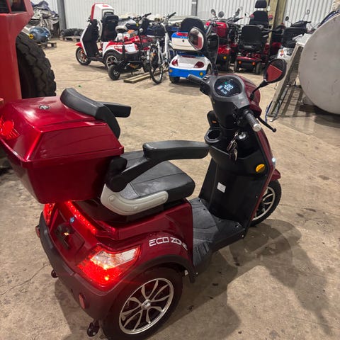 El-scooter trehjuling i svart utförande med stort, vadderat komfortsäte med armstöd och nackstöd. Scootern har tre hjul med breda däck för stabilitet samt fotplatta med halkskydd. Utrustad med styre med backspegel, belysning fram och instrumentpanel. Bak finns en metallkorg för transport av mindre saker. Lämplig som eldriven färdmedelslösning för kortare resor på jämnt underlag.