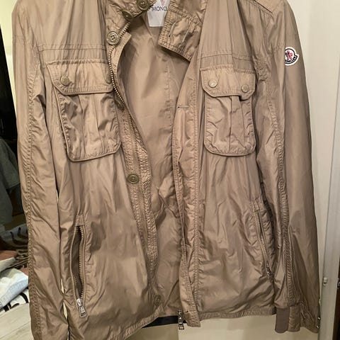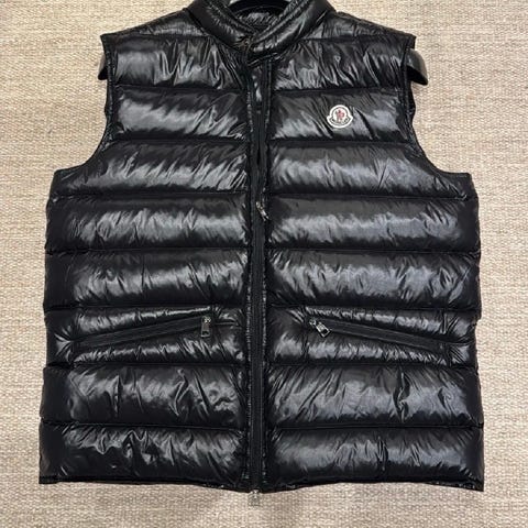 Moncler dunväst för herr i storlek L. Västen är grön och vadderad med dun, med horisontella kanaler. Den har dragkedja framtill och två framfickor med dragkedja. Passar som ytterplagg eller mellanlager vid kyligare väder.