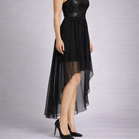 festklänning för dam i storlek M. Passar S/M. Klänningen är svart och tillverkad i polyester. Modellen har åtsittande överdel med glittrande material och transparenta partier upptill och nedtill. Dekorativa applikationer och mönstrade detaljer ger ett markerat uttryck. Passar för fest och andra uppklädda tillfällen.