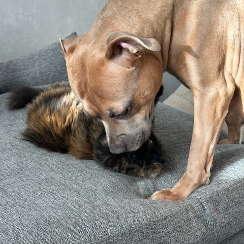 En riktig soffpotatis som älskar att ligga i knät i soffan. Hon är också den som snor ens kudde i sängen när hon får chansen. Hon är uppvuxen bland både barn och andra hundar. Dock vill hon INTE bo med andra hundar längre. Nyårsafton 2024 fick hon 7 valpar. Efter detta har hennes zonförsvar och vaktande exalerat. Hon vaktar både saker, godis och personer mot de andra hundarna. Därför söker hon nu ett hem utan andra djur. Katter hatar hon och gjort hela sitt liv.