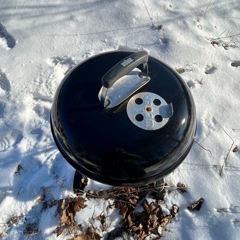 Kolgrill i klotmodell i rödbrun metall. Grillen har lock med ventil, handtag på sidorna samt benställning. Passar för grillning utomhus i trädgård, på altan eller liknande ytor där kolgrill är tillåten.