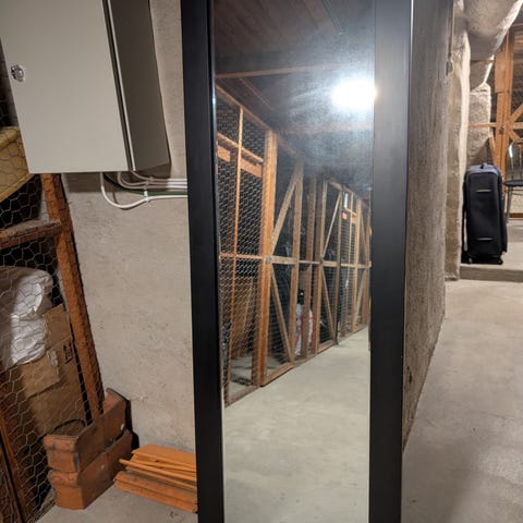 Ikea spegel för helkropp i vit färg. Rektangulär modell som kan användas i hall, sovrum eller klädkammare för helkroppsspegling. Monteras mot vägg.