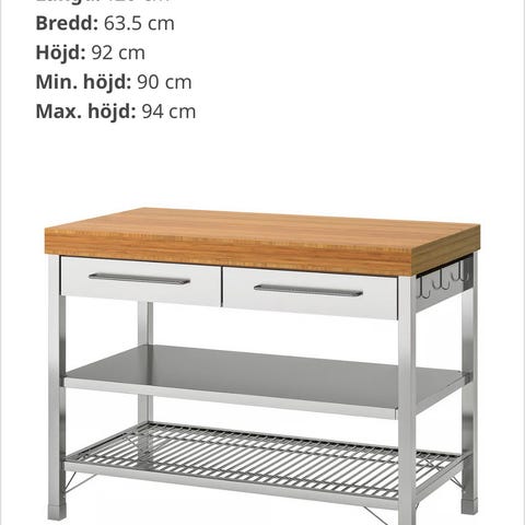 Köksvagn i trä med vit stomme och träfärgad toppskiva. Vagnen har en låda med metallknopp, en öppen hylla i trä samt en nedre vit hylla. Utrustad med hjul för enkel förflyttning. Passar som extra avlastningsyta i kök eller som sidobord i andra rum.