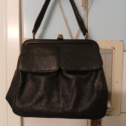 Elegant handväska från 50-talet med ett distinkt ormskinnsmönster. Väskan har ett klassiskt rektangulärt format med ett handtag upptill och ett metallspänne som stängning. Mått 27 cm lång, 21 cm hög och 9 cm bred.