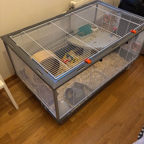 Det är en Ferplast Krolik-bur i storlek 200 × 60 × 50 cm – en rymlig och bra bur som passar perfekt för både kanin och marsvin. Den är i fint skick utan skador. Det finns några typiska fläckar i botten, men inget som påverkar funktionen och som högst troligt går att skrubba bort vid rengöring 🤗