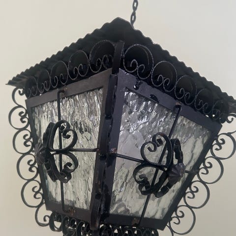 Två vackra retro taklampor i koppar och smide med dekorativa detaljer. Lamporna är ovalformade i unik design. De är i bra skick och har en fin patina. Den är perfekt för att skapa en mysig och rustik atmosfär i ditt hem.