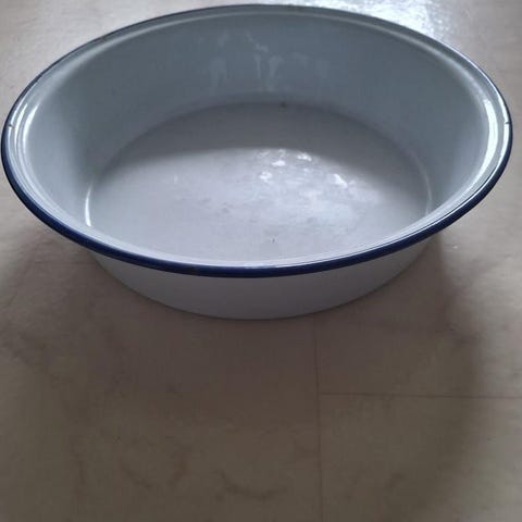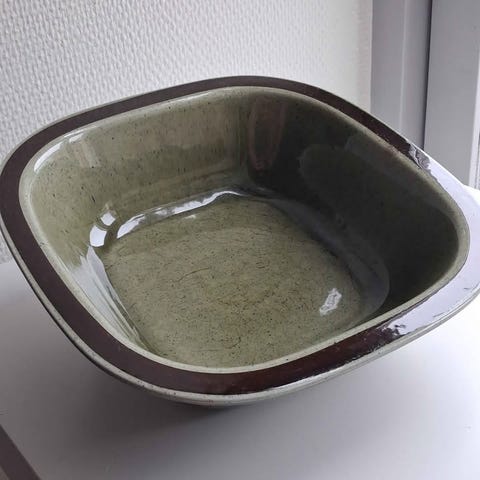 Förvaringsburk med lock. Fyrkantig form med rundade hörn, beige insida och utsida samt grön kant upptill.