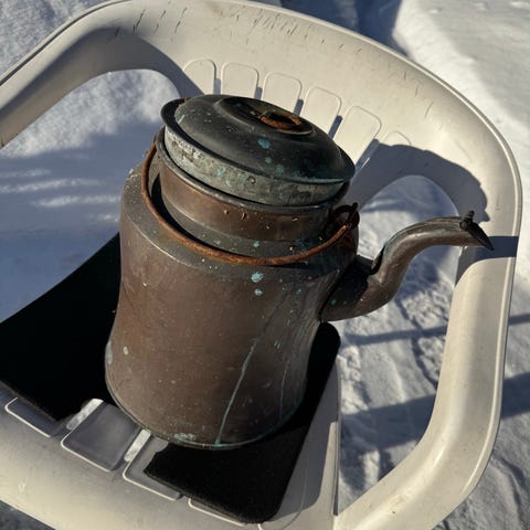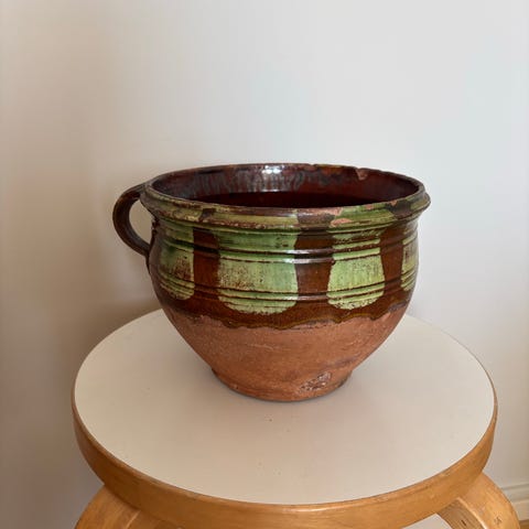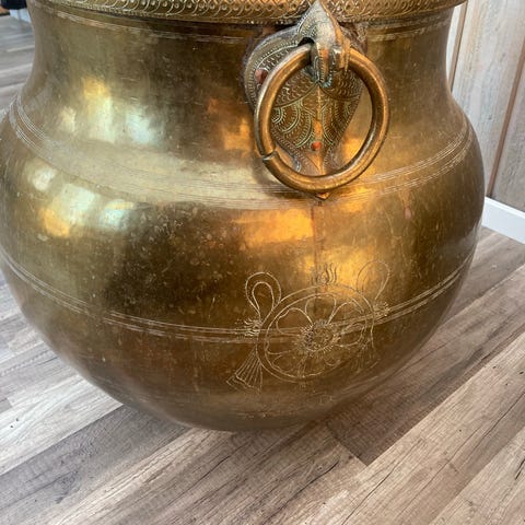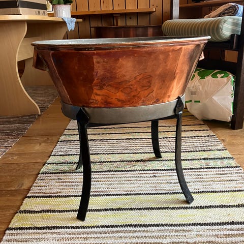 Denna fina pannmur i koppar användes av mina morföräldrar att blötlägga och tvätta i. Mina föräldrar hade blommor i den. Mått diameter 68 cm. Höjd 26 cm och med ställningen 46 cm.