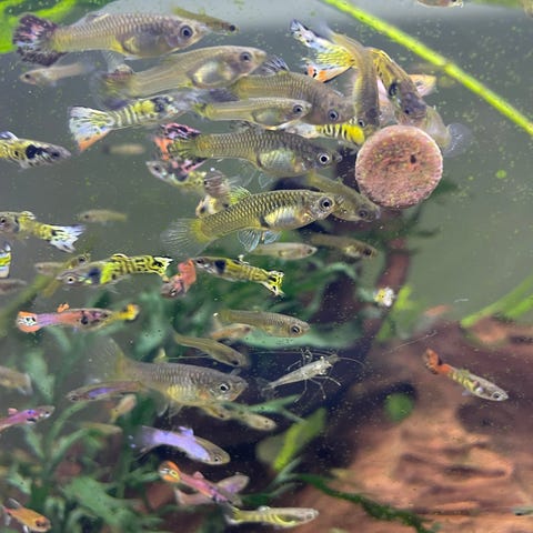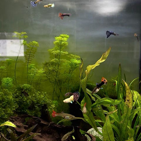 Akvarium, guppy och räkor.